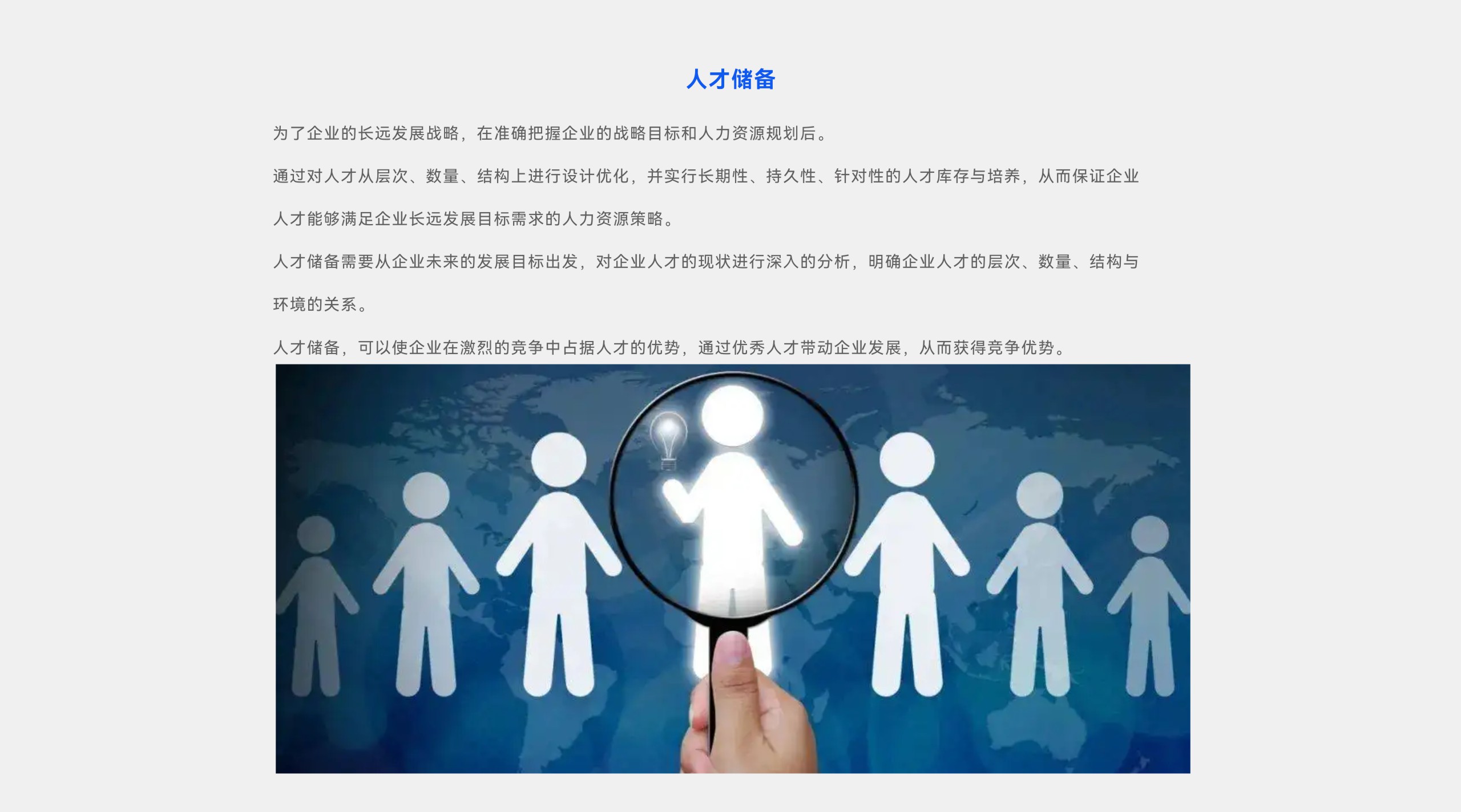 為了企業(yè)的長(zhǎng)遠(yuǎn)發(fā)展戰(zhàn)略,在準(zhǔn)確把握企業(yè)的戰(zhàn)略目標(biāo)和人力資源規(guī)劃后。 通過對(duì)人才從層次、數(shù)量、結(jié)構(gòu)上進(jìn)行設(shè)計(jì)優(yōu)化,并實(shí)行長(zhǎng)期性、持久性、針對(duì)性的人才庫(kù)存與培養(yǎng),從而保證企業(yè)人才能夠滿足企業(yè)長(zhǎng)遠(yuǎn)發(fā)展目標(biāo)需求的人力資源策略。
